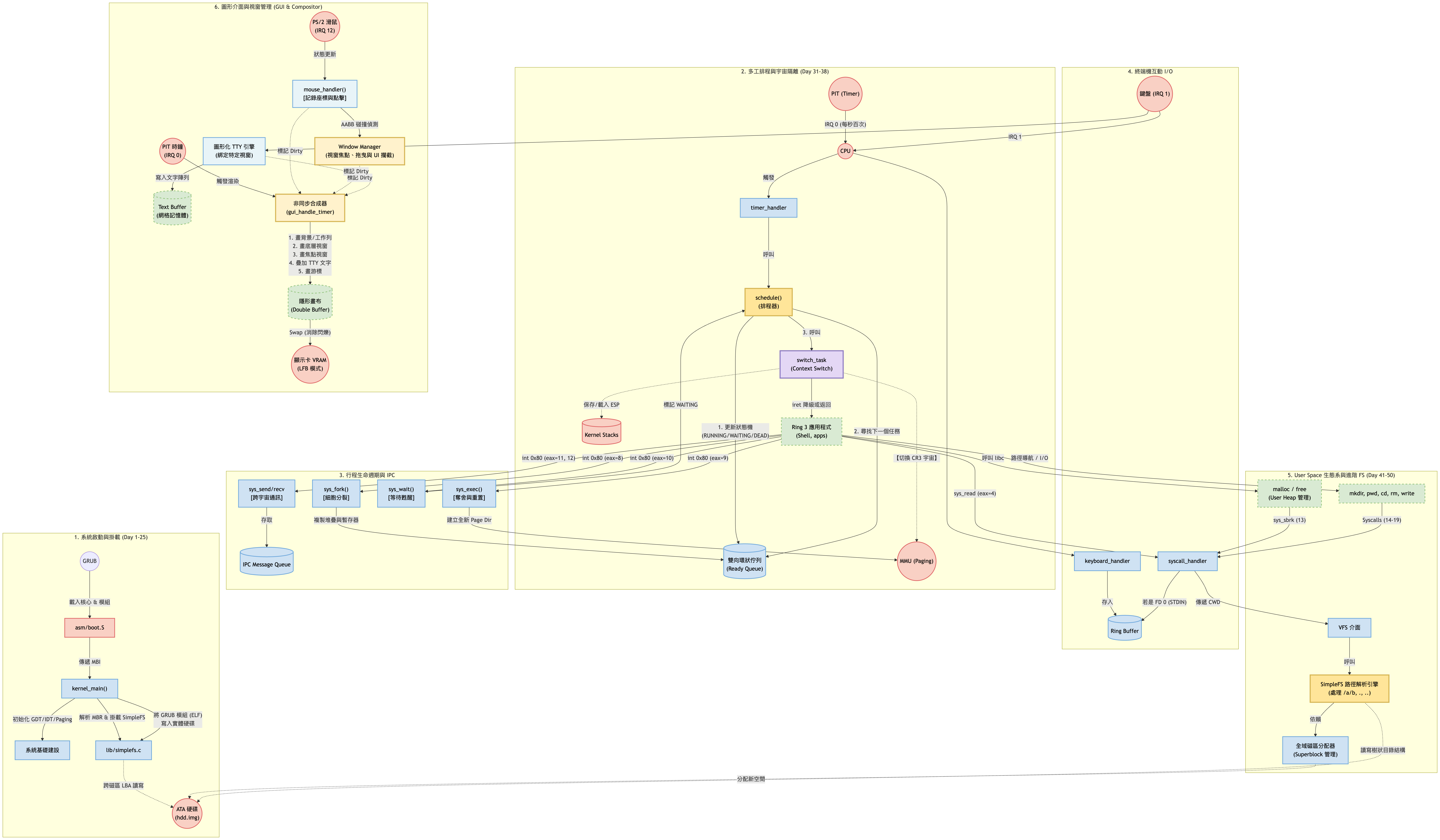 fork/exec機制、Shell的誕生,以及 IPC (進程間通訊) 與 Mutex 機制。 - 使用者空間 (User Space) :開發 C Library,包含
