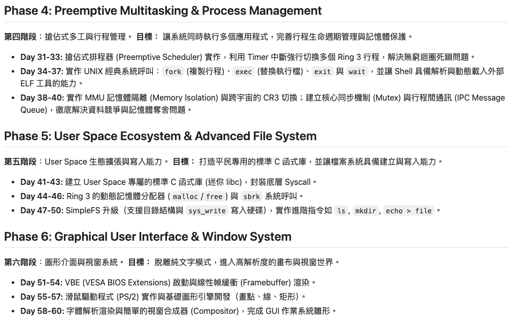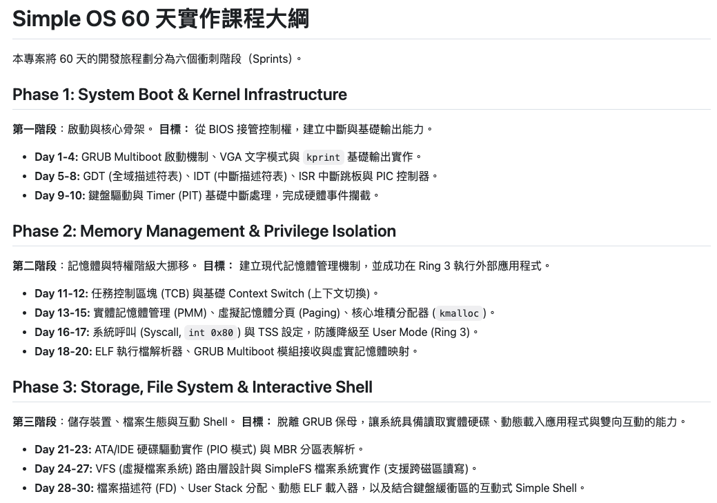這個課程內容,嚴格說比 30 天打造 OS - 作業系統自作入門 簡單很多,算是很容易快速上手、或者說體驗開發作業系統的種種問題。我實作完之後,回去翻 恐龍書、30 天打造 OS 感覺是偏簡單的。可能是我本身就已經在實務上有一定程度的經驗。