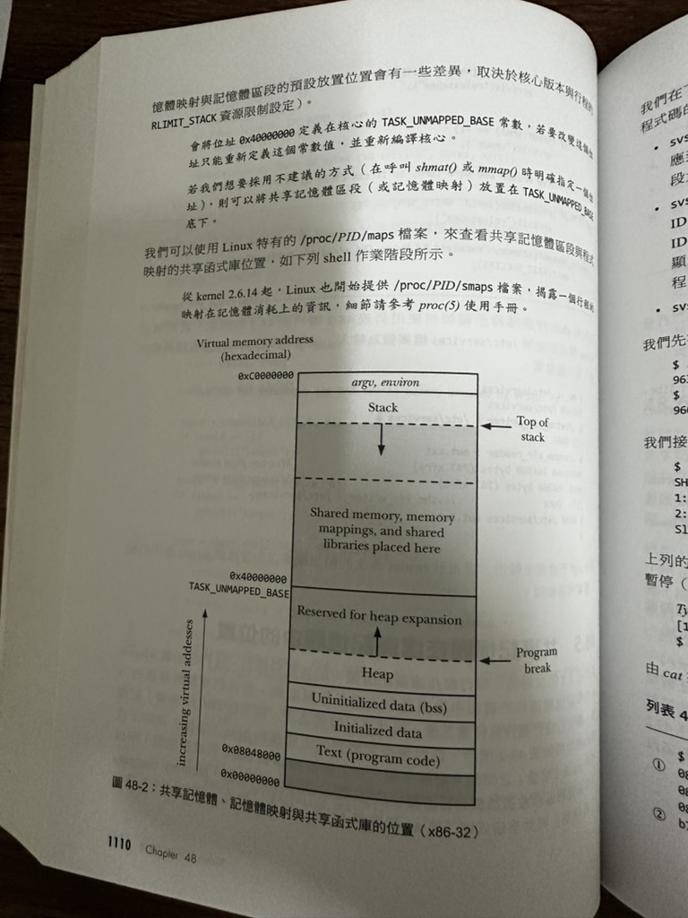 但恐龍書講的是概念,缺少實作。所以我又透過 Linux Programming Interface 了解更多實際上在 Linux 上怎麼實作的細節,像是 Linux 怎麼管理共享記憶體。