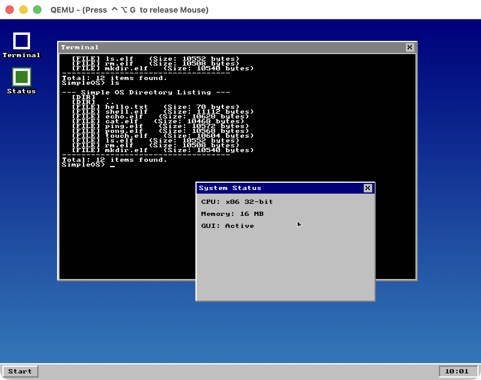 malloc/free/printf等基礎函式。透過 Syscall 打造基礎指令(ls/mkdir/cat/touch/rm)及內建指令(cd/pwd/exit)。 - 圖形介面 (GUI) :實作簡單的視窗介面,包含滑鼠 I/O、Double Buffering(雙重緩衝)機制、字型渲染,並實作基礎的 Window Manager。