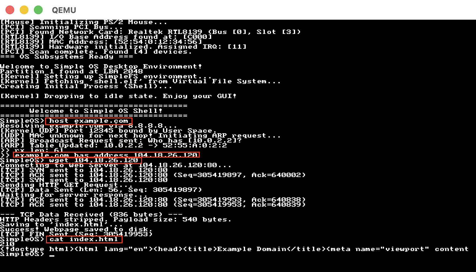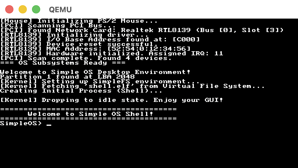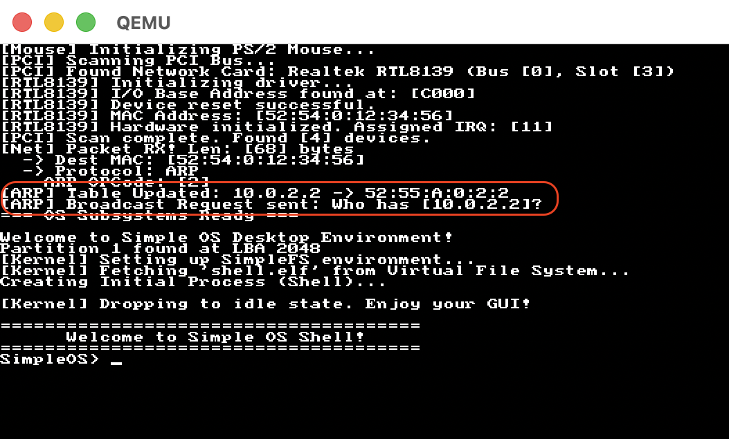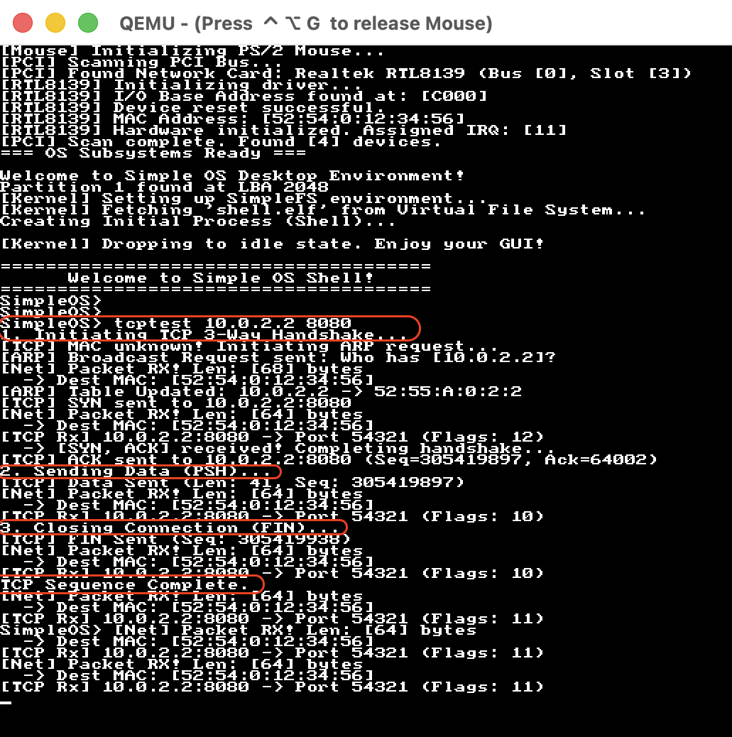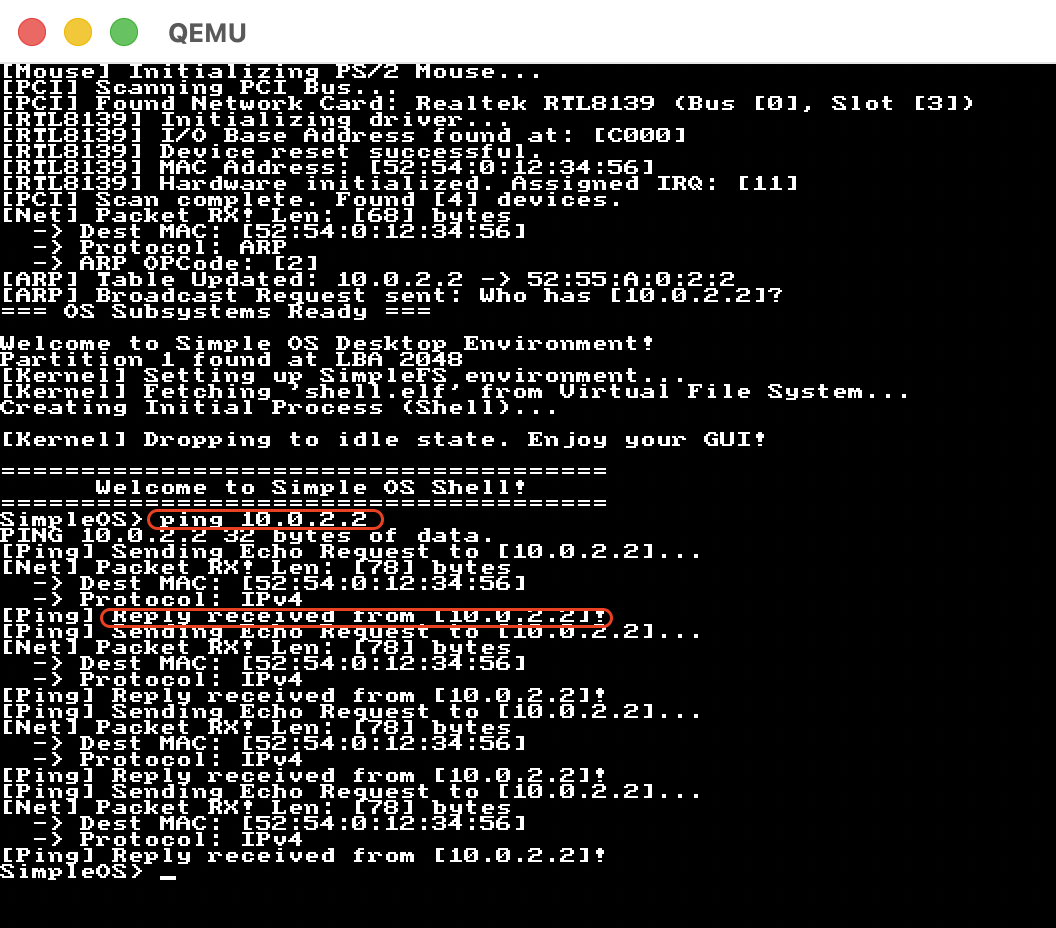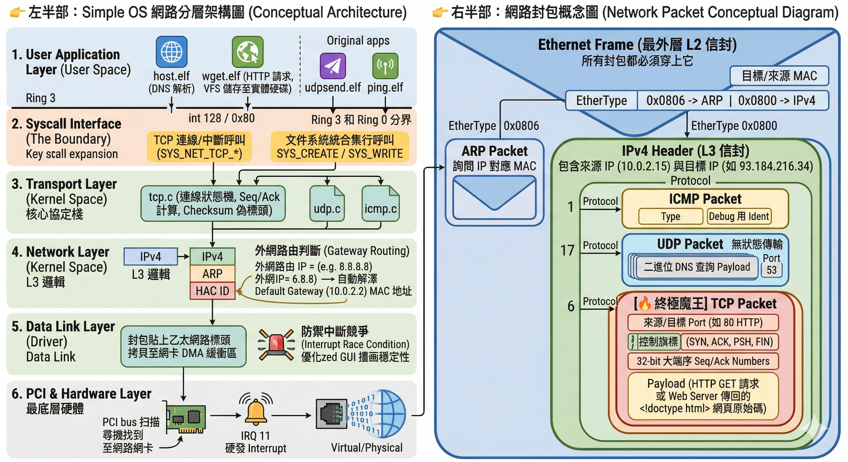 自幹作業系統 完成第一階段之後,感覺意猶未竟,有很多東西想繼續玩玩看,所以開啟了第二階段,其中最複雜也數最有趣的是 網路基礎 (Networking Fundamentals) 部分,從最底層硬體 PCI Bus 掃描,實作驅動程式 (RTL8139)、到 Ethernet Layer (L2)、IPv4、ARP、ARP Table、UDP、TCP … 一路打上去,最後用 ping、host、wget、udprecv、tcptest 等 User Space 封裝的應用程式做驗收。