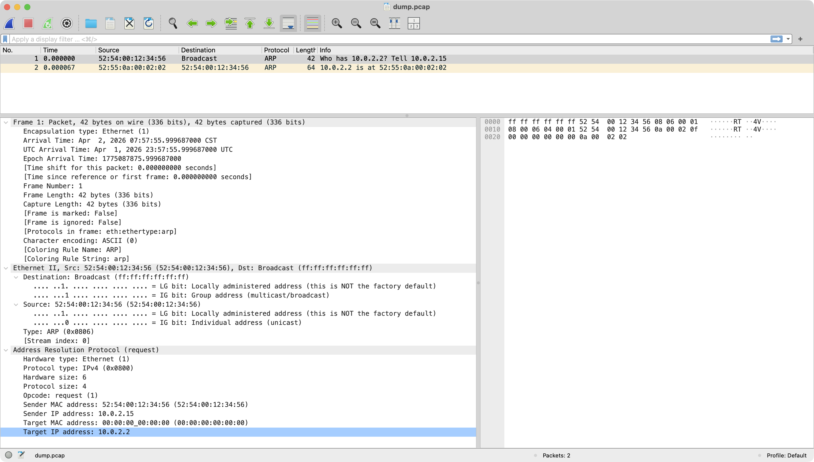 廣播請問誰的 IP 是 10.0.2.2,請回覆你的 Mac Address,然後存到 ARP Table 裡。