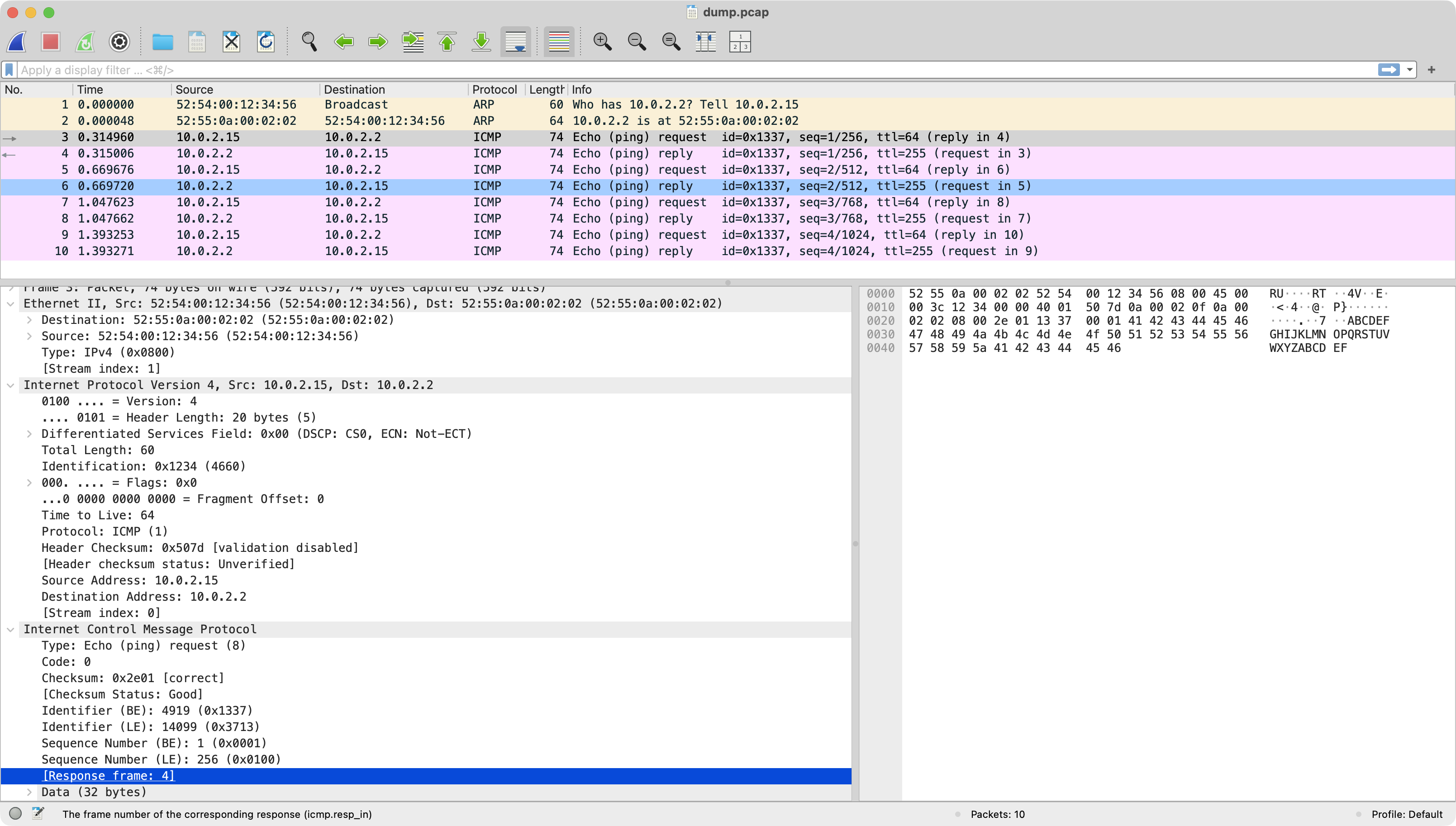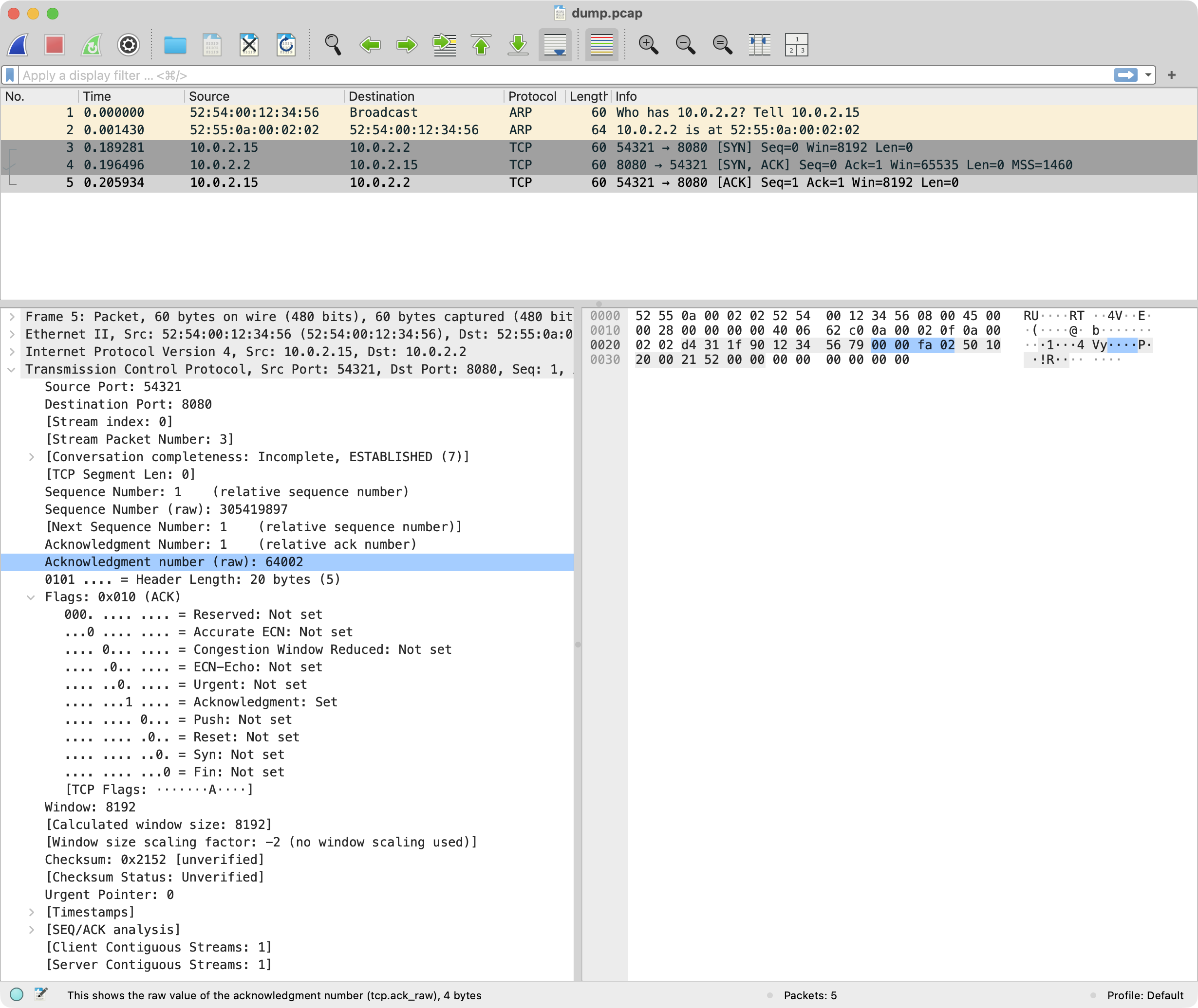 底下兩張是用 tcptest 這個應用程式送出 TCP_PSH flag,把資料送透過 QEMU router 轉送給 Host Machine 的 nc 接收到資料 Hello macOS, ...,最後則是結束對話 TCP_FIN flag,完成整個交握。