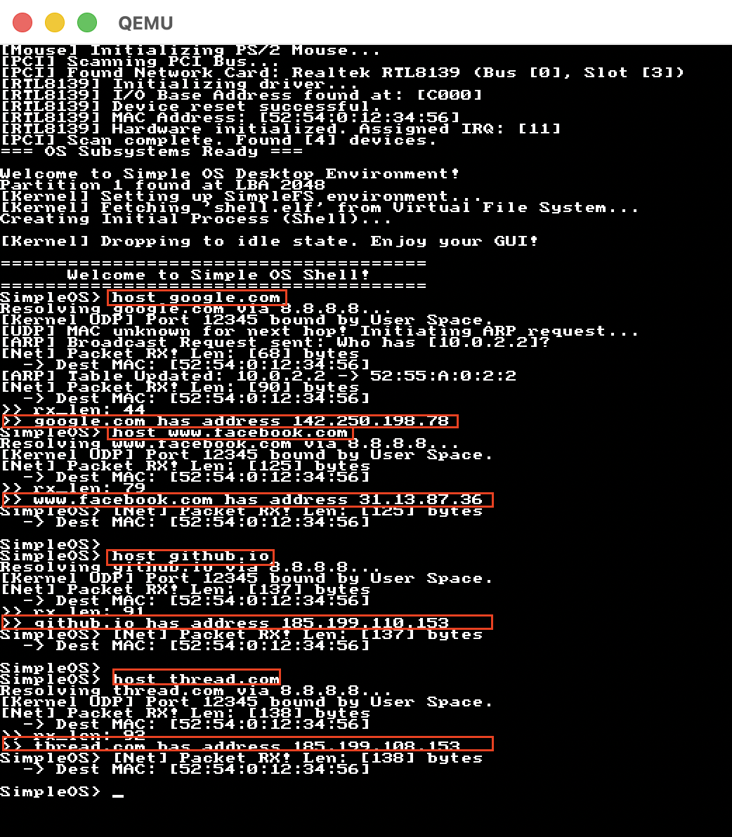 ping: 送出封包給 QEMU routerudprecv: 接收 UDP 封包tcptest: 送出 TCP 封包,完成三項交握,同時包含資料host: DNS resovler,需要調整 QEMU 網路卡的設定,讓他跟 host machine 對接- DNS 整個實作完全是在 User Space,沒有走 syscall