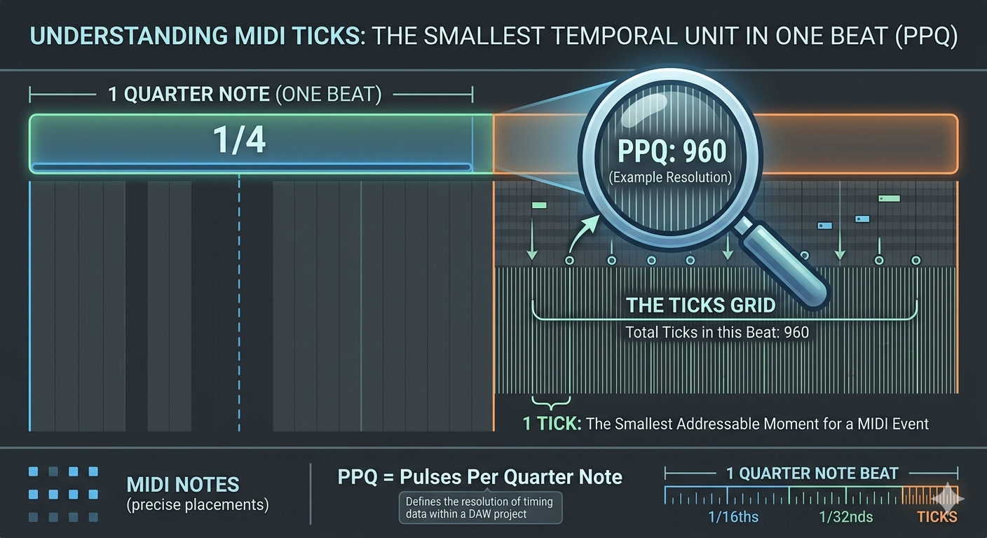 PPQ (Pulses Per Quarter Note),例如 PPQ=360,代表一拍可以再細分 360 個等分,透過這樣的方式可以紀錄演奏更細緻的表情,像是琶音這種技巧。現代的 DAW 像是 Logic Pro、FL Studio 預設為 960 PPQ。下圖由 Google 產生