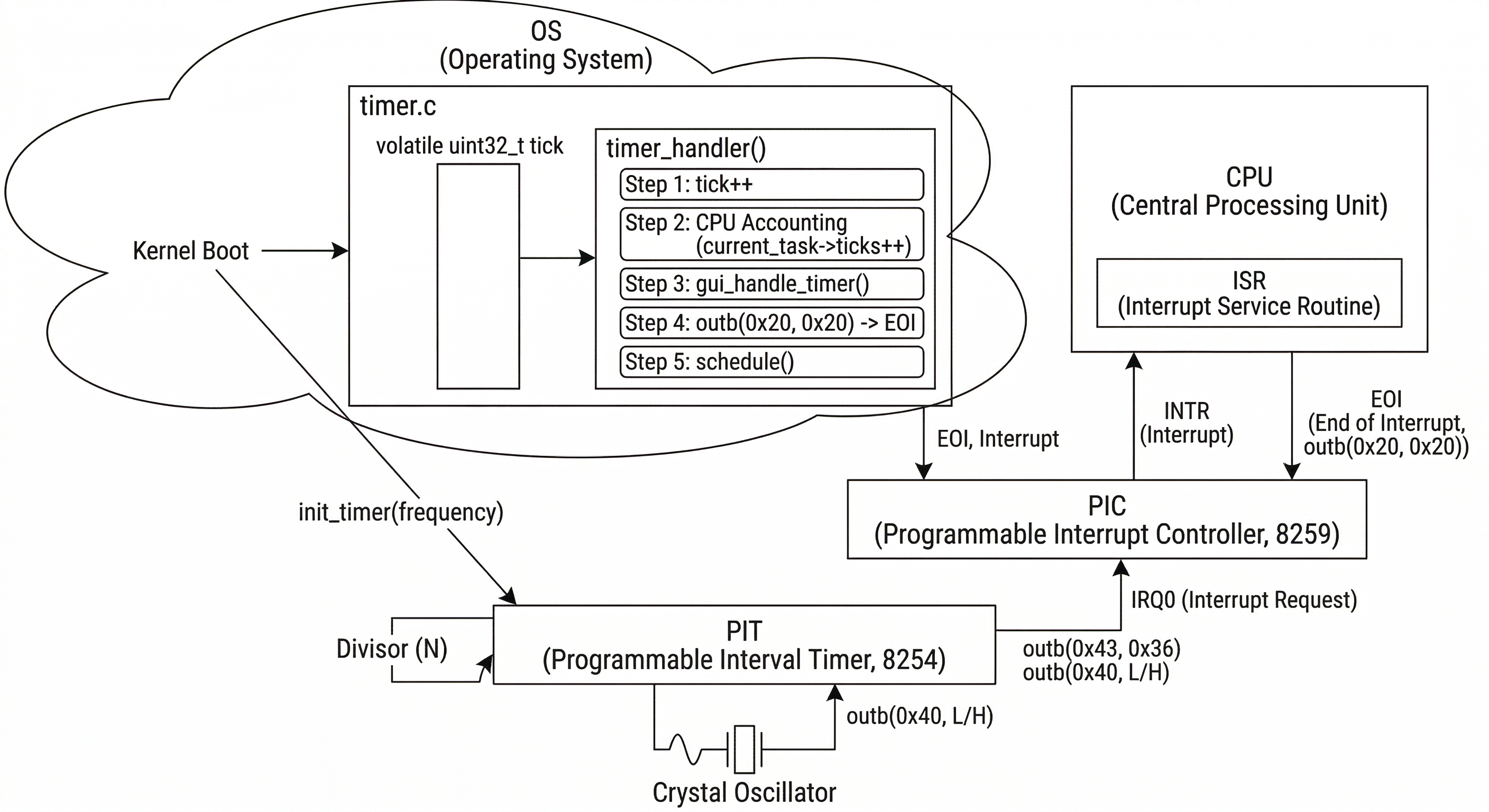 中斷控制器 (Programmable Interrupt Controller, PIC) 通常是 Intel 8259 這顆晶片,是介於所有硬體設備(如 PIT、鍵盤、滑鼠)與 CPU 之間的「通訊官」。PIC 的角色如同警衛,在 PIC 向 CPU 發出中斷訊號後,會自動擋住後續的所有硬體中斷訊號。如果 OS 不回覆 EOI (End of Interrupt) 指令給 PIC,PIC 會判定 CPU 仍在處理舊的中斷,導致 PIC 停止發送任何新的中斷訊號給 CPU,最終造成 OS 無法接收新的 Tick 或硬體事件,系統表現如同「當機」。