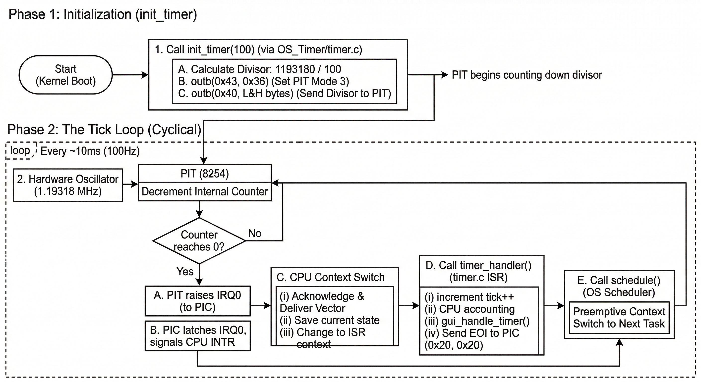 實際的運作原理是利用 INTEL 8254 的基頻 - 1,193,180 Hz,我們想在每秒產生 100 次中斷 / 100 個 tick,在 timer.c#init_timer() 計算方式如下: