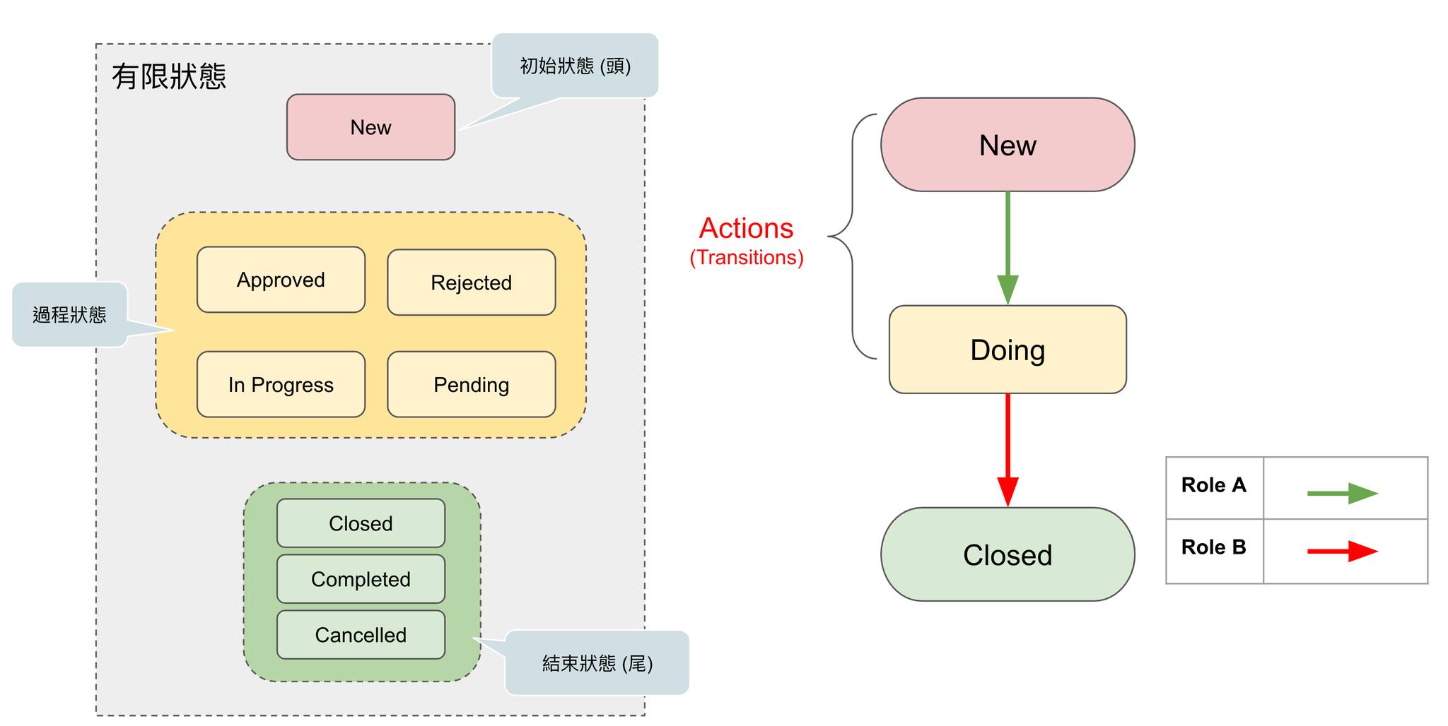 - 每個角色能夠執行的狀態移轉不一樣,需要個別定義