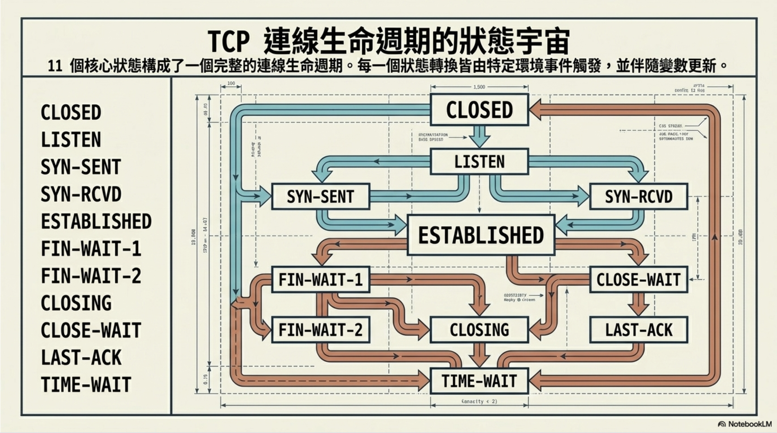 這篇 TCP 原始論文: “EFSM/SDL modeling of the original TCP standard (RFC793) and the Congestion Control Mechanism of TCP Reno“ ,整理了所有相關的 TCP 狀態圖,共有 38 張。下圖是用 NotebookLM 整理的狀態機,一共有 11 states.